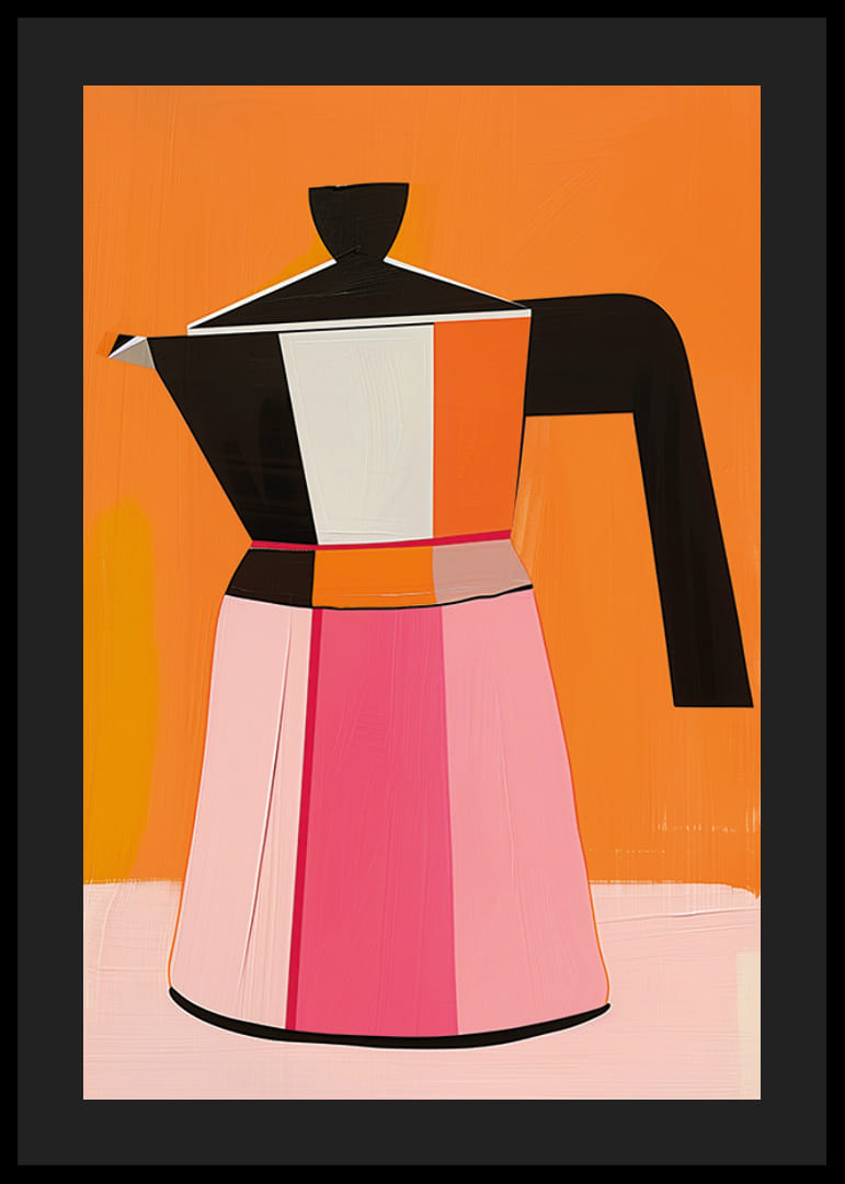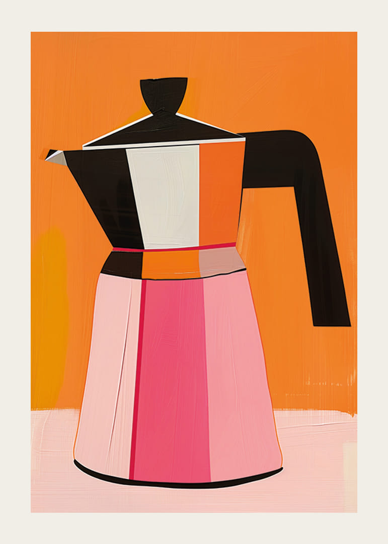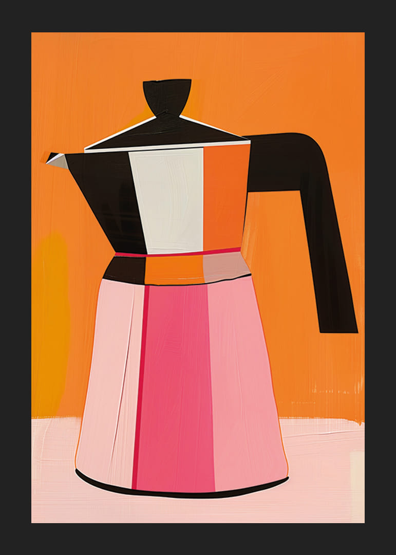 Šis plakāts piesaista uzmanību ar mūsdienīgu kafijas automāta attēlojumu, kas mākslinieciski atveidots treknos krāsu blokos. Uz silta oranža fona alus darītavas kontūras parādās melnā, baltā, rozā un oranžā krāsā, radot jauku līdzsvaru starp retro stilu un moderno mākslu.