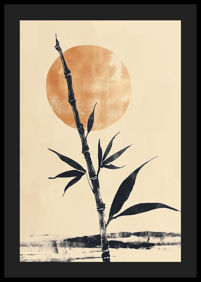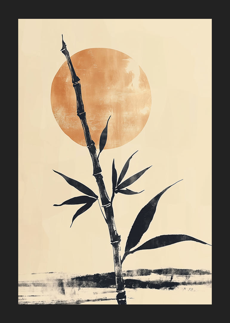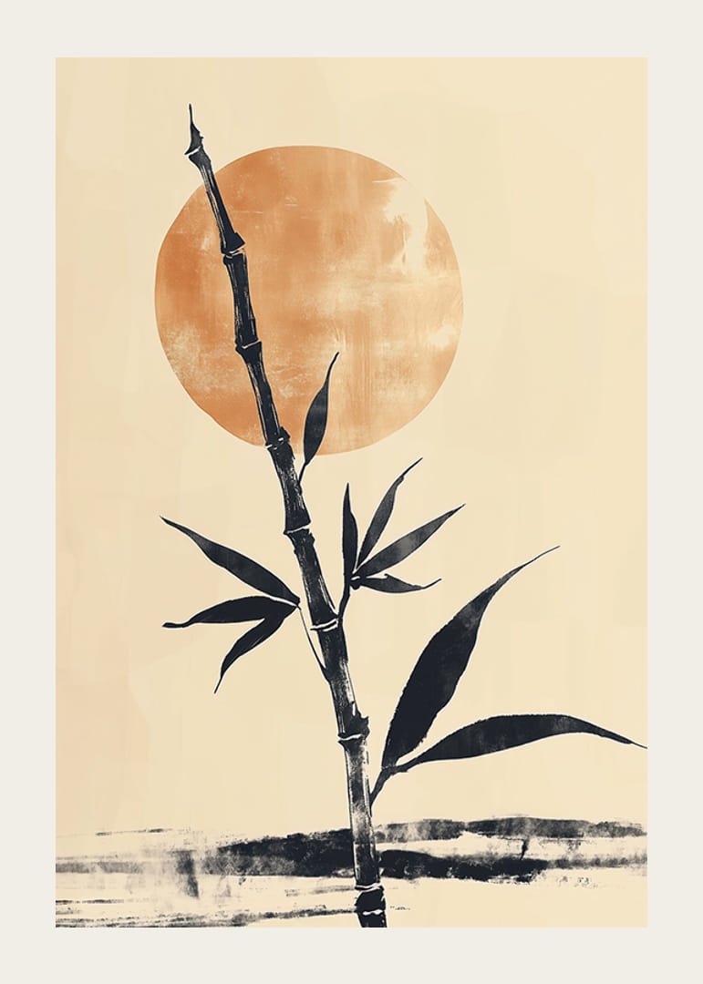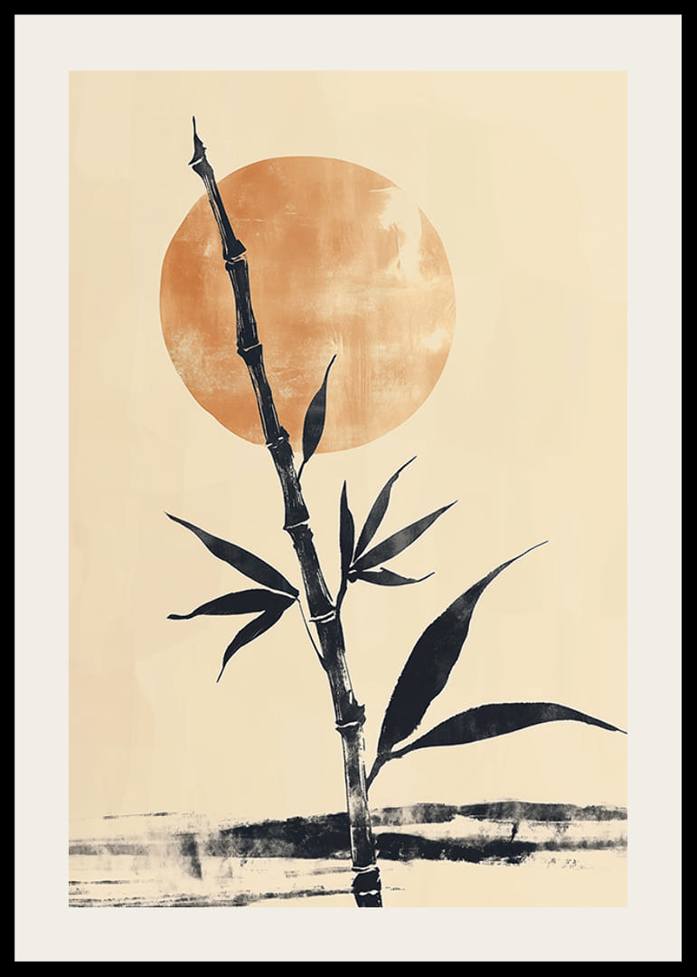 Šis plakāts tver miera sajūtu ar elegantu bambusa kātu, kas stāv maiga, zeltaina saullēkta priekšā. Kontrasts starp tumšo bambusu un siltajām debesīm rada harmonisku līdzsvaru, kas telpai piešķir dzena sajūtu.