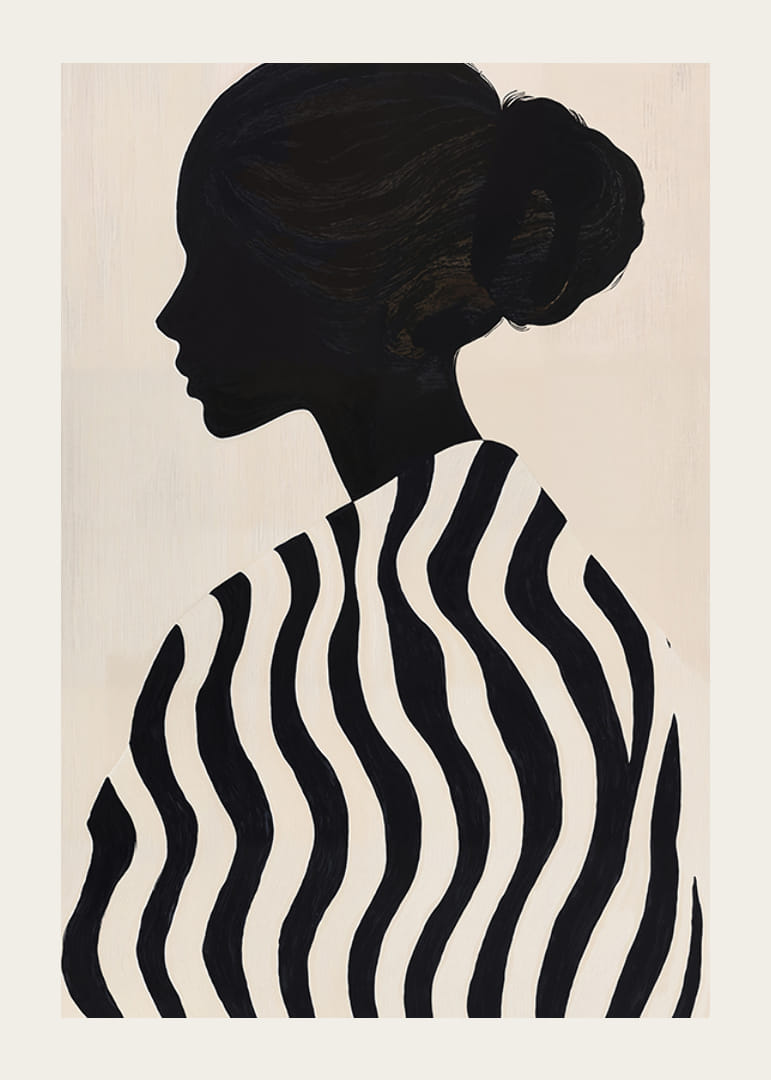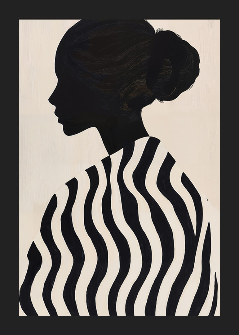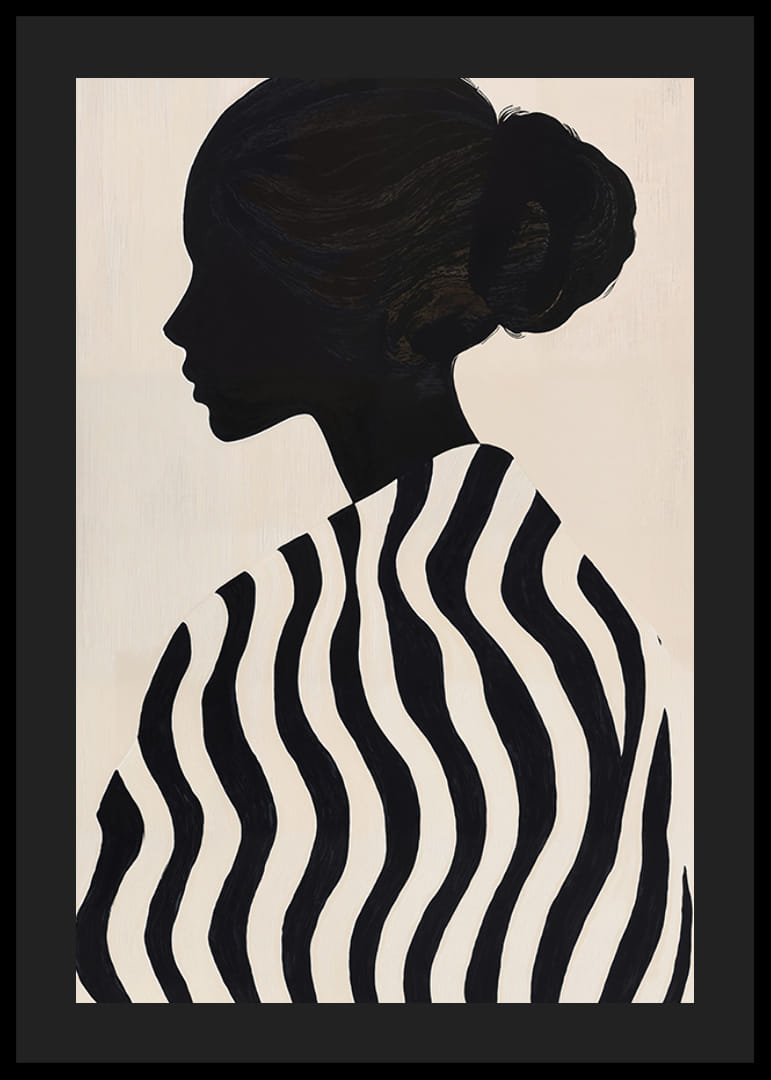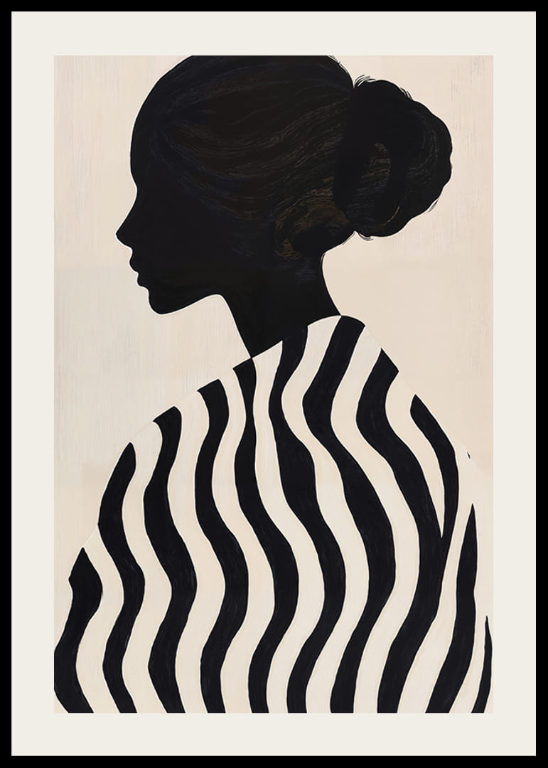 Šis plakāts tver elegantu sievietes siluetu profilā, kas ietīts aizraujošā melnbaltā viļņotu līniju rakstā. Kontrasts starp maigo izskatu un dinamisko rakstu rada gan klusuma, gan kustības atmosfēru.