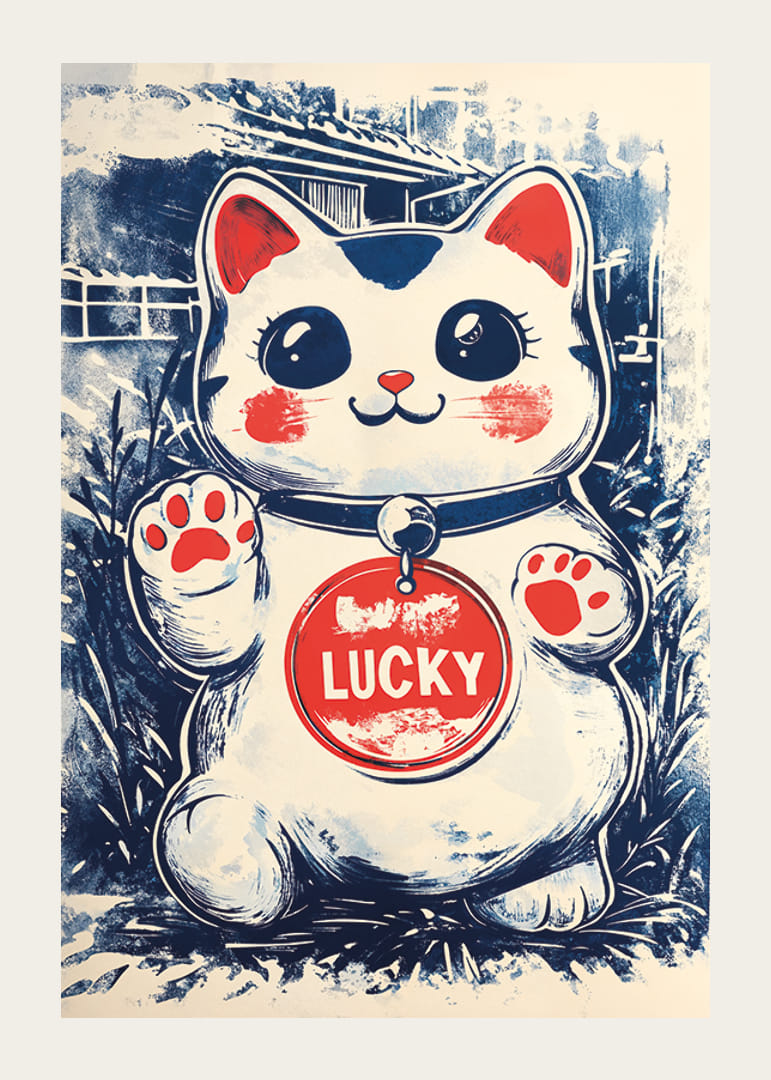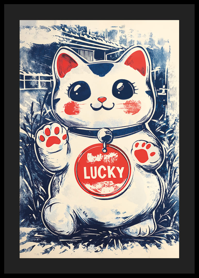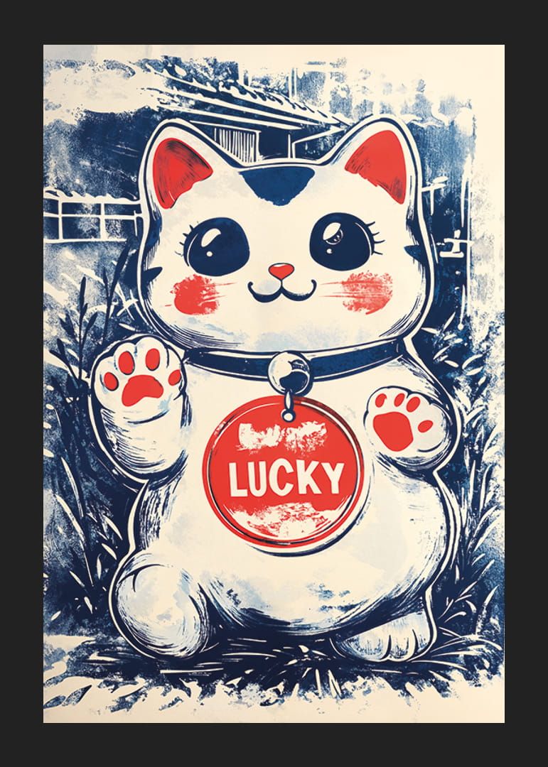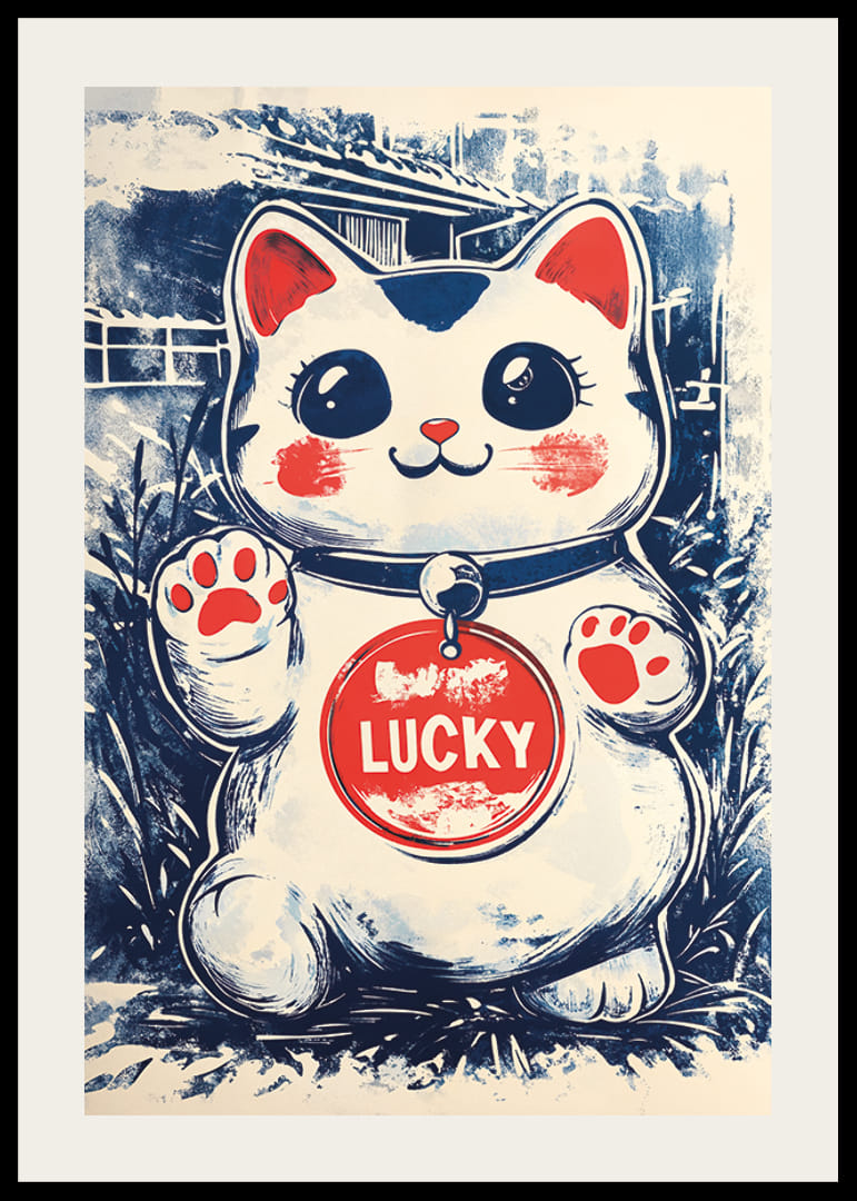 Šo Japandi plakātu rotā burvīgs laimīgais kaķis, kura lielās acis un rotaļīgā izteiksme rada telpai prieka un pozitīvisma sajūtu. Plakāta krāsas ar maigi zilu un silti sarkanu nokrāsu harmoniski papildina viena otru, radot vizuāli pievilcīgu atmosfēru.