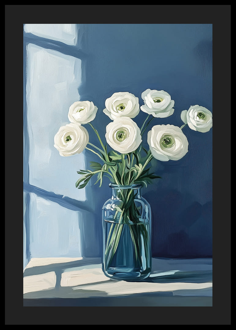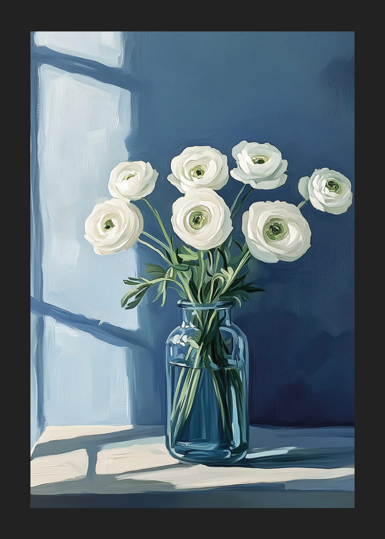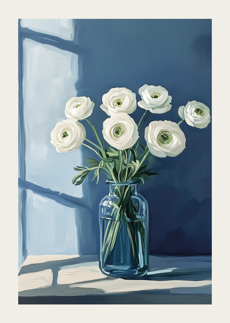 Šis plakāts izstaro miera sajūtu, kur balti ziedi ir eleganti izvietoti spilgti zilā vāzē uz klusināti zila fona. Gaisma no loga met maigas ēnas, radot miera un graciozitātes atmosfēru. Šis plakāts kļūst par nomierinošu centrālo elementu telpā, piedāvājot perfektu līdzsvaru starp dabu un modernu vienkāršību. Ideāls mākslas darbs, lai papildinātu jūsu mājas ar mieru un skaistumu.