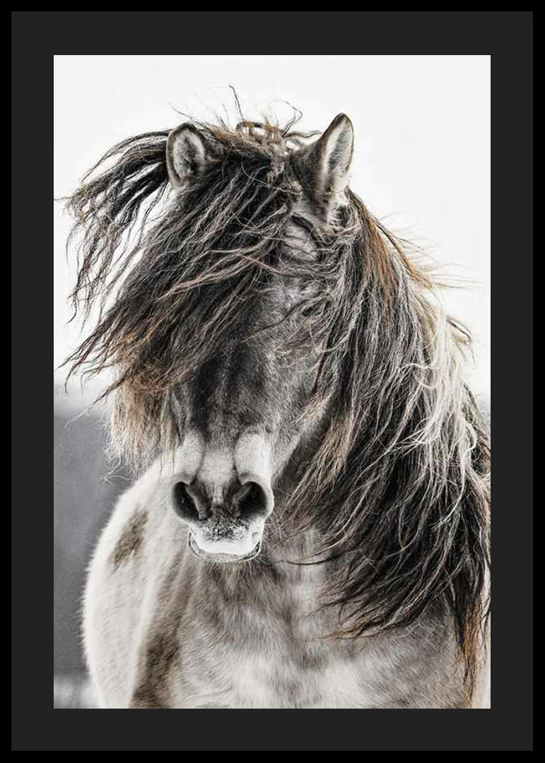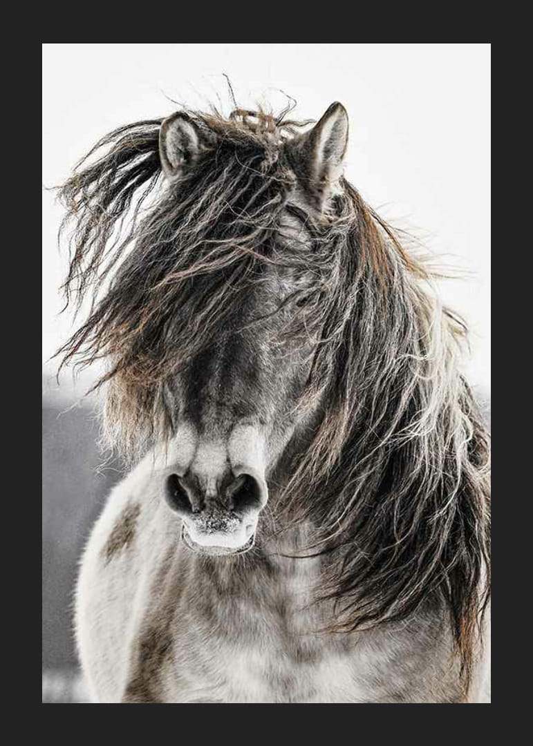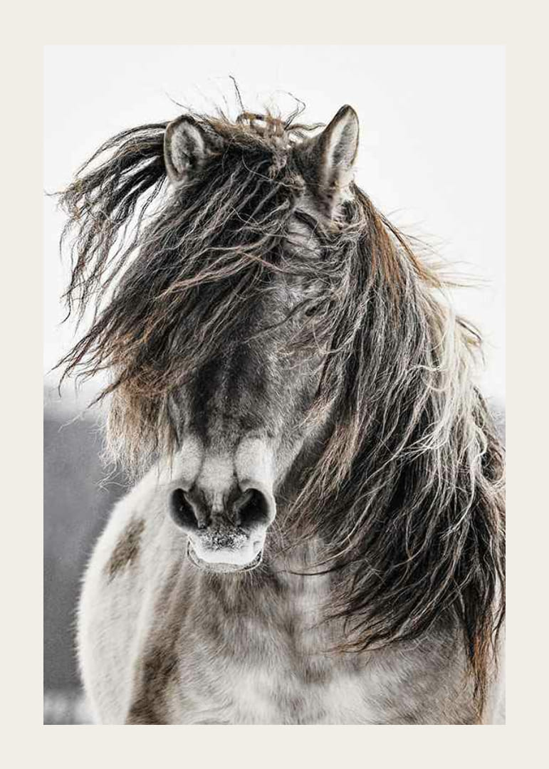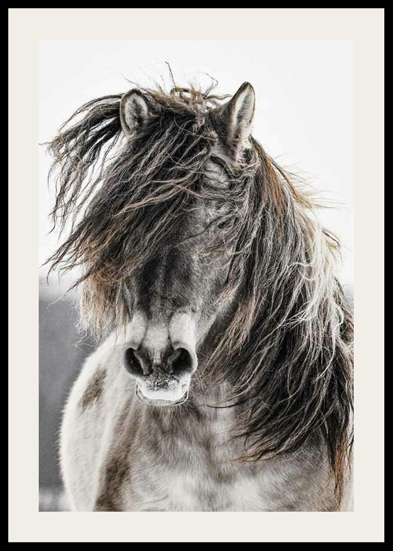 Motīva centrā attēlots savvaļas zirgs ar kuplām krēpēm. Krāsu gamma ir klusinātos, dabiskos toņos ar kontrastu starp zirga detalizēto kažoku un gaišo, izplūdušo fonu. Plakāts rada dabisku sajūtu un ir piemērots, piemēram, viesistabām, guļamistabām vai gaiteņiem mūžīgam lauku stilam.