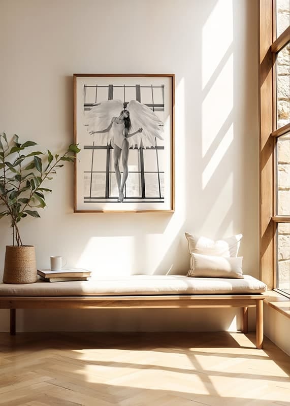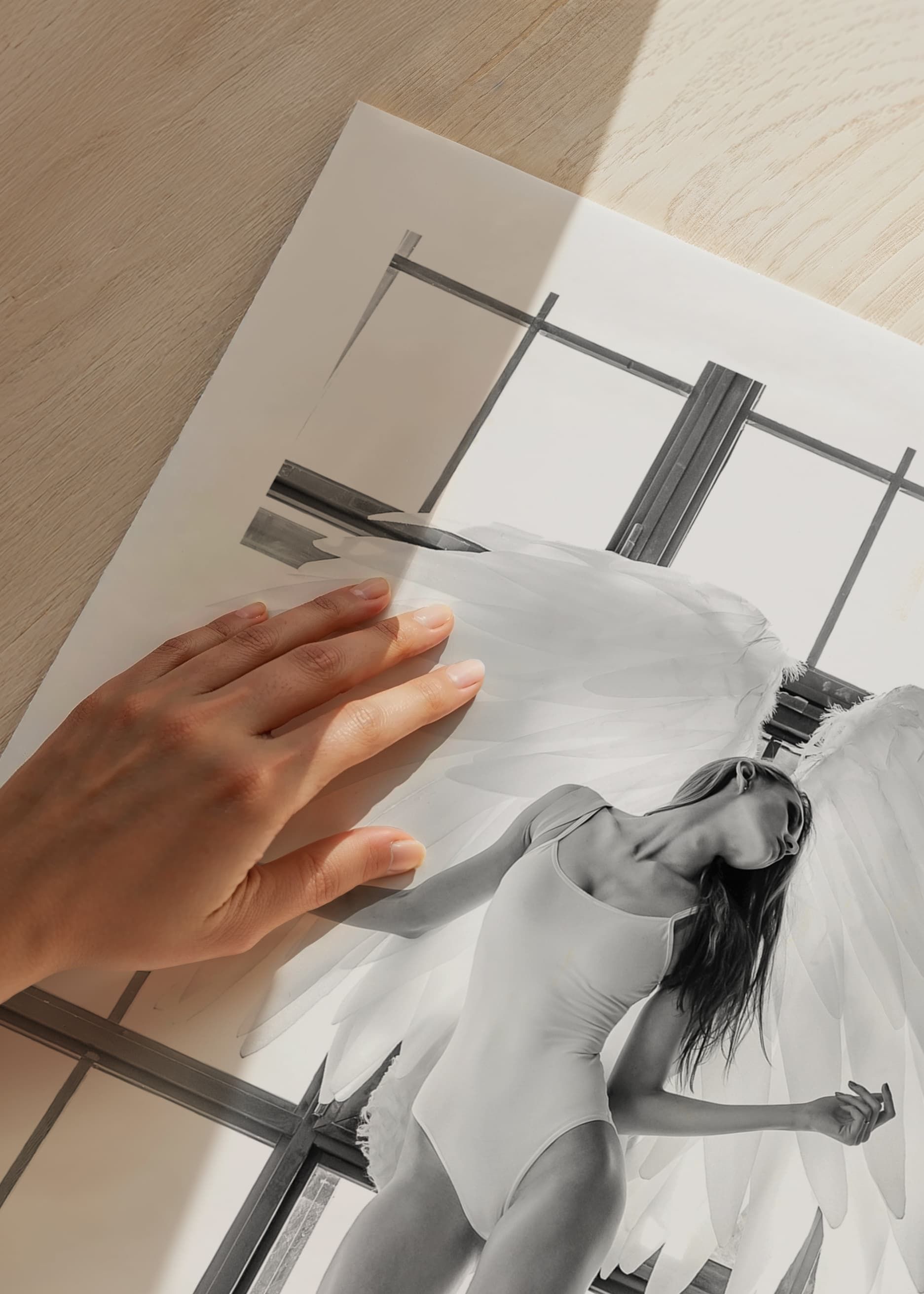 Motīvs ir sieviete baltā peldkostīmā ar lieliem eņģeļa spārniem, kas melnbaltā krāsā stāv pie augsta loga. Gaismas piepildītā telpa izceļ tīrās līnijas un rada gaisīguma iespaidu. Plakāts ar modernu noskaņu, kas guļamistabai vai viesistabai piešķir dinamismu un personību.