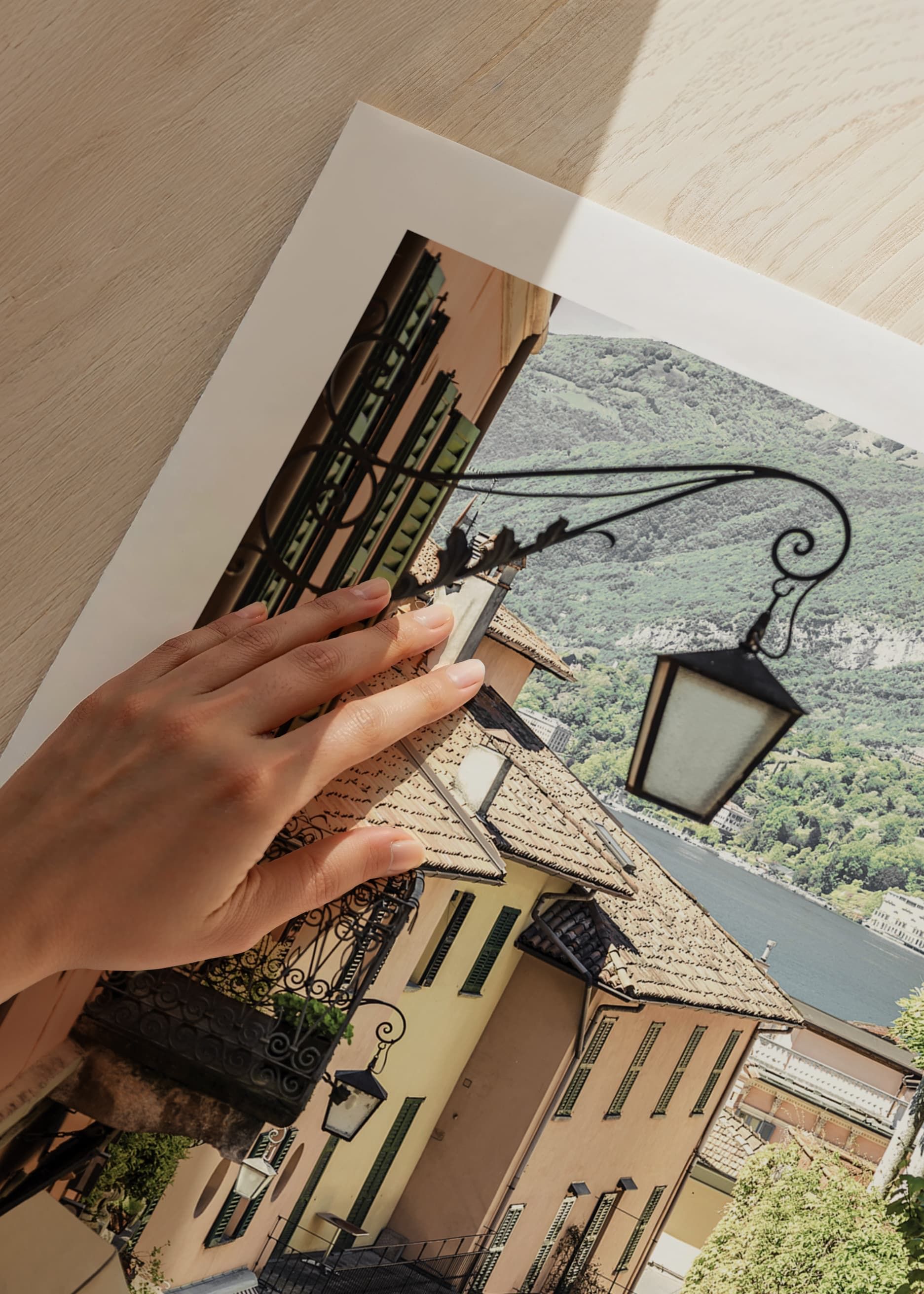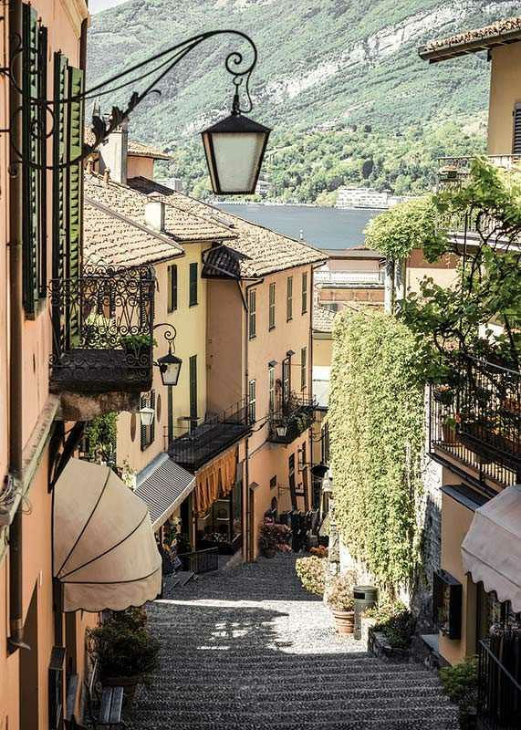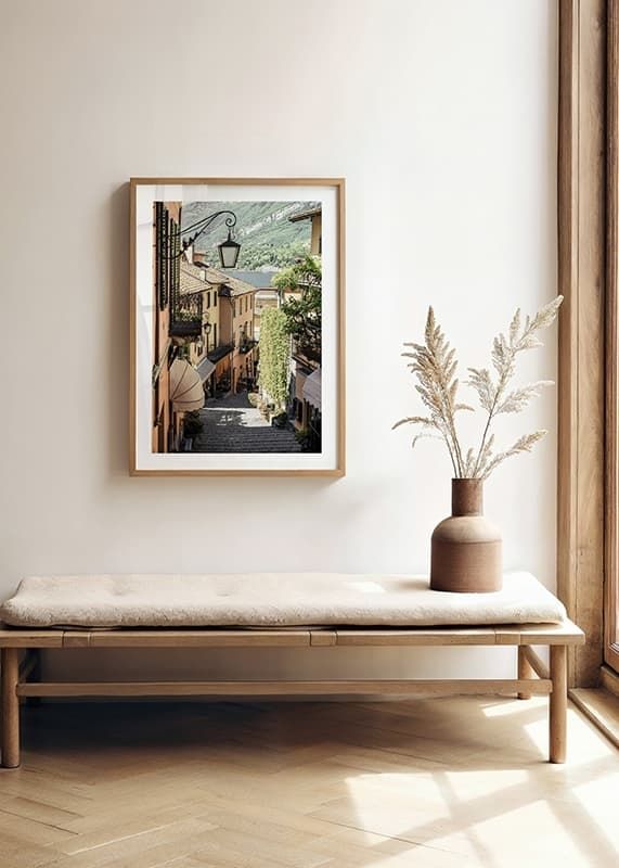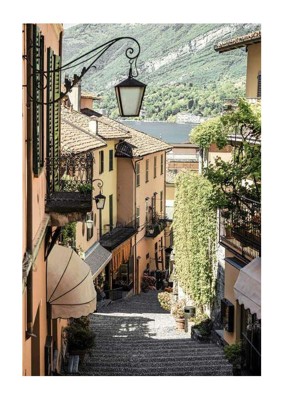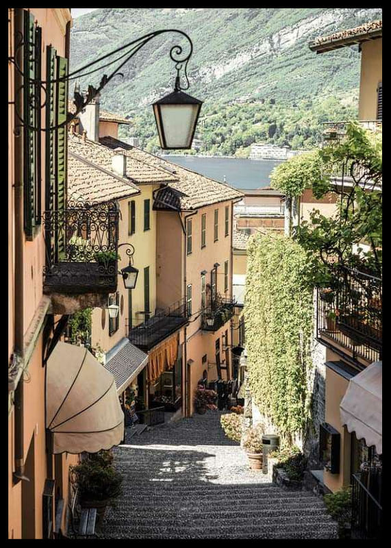 Bruģakmens aleju Bellagio, Itālijā, klāj persiku krāsas fasādes, kaltas dzelzs balkoni un zaļi augi. Fonā var redzēt ezera un zaļo kalnu skatienu. Šis plakāts atspoguļo Itālijas mazpilsētas šarmu un arhitektūras detaļas – ideāli piemērots mājām ar ceļojuma un pilsētas dzīves noskaņu.