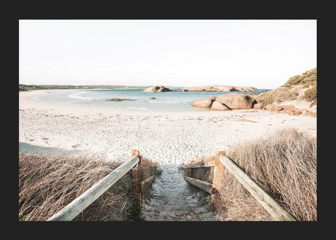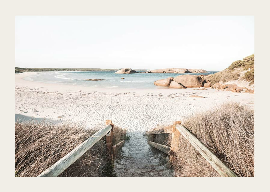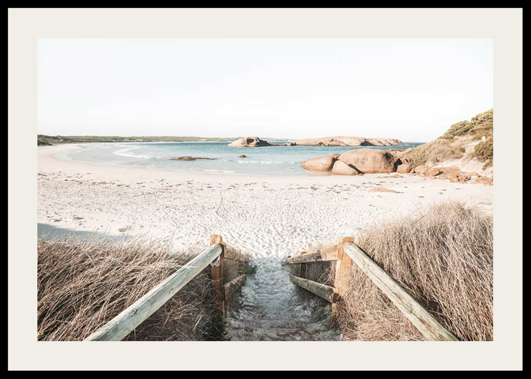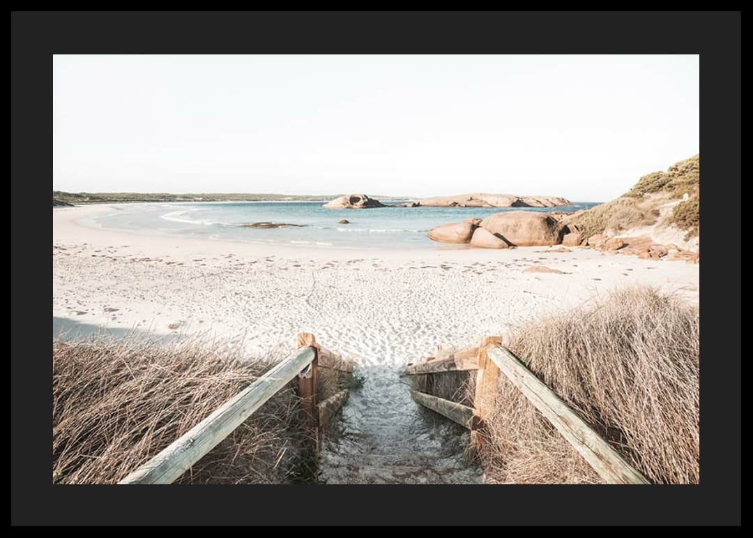 Koka kāpnes ved lejup uz plašu smilšainu pludmali un mierīgu zilu jūru ar mīkstiem akmeņiem gar krastu. Gaisma ir skaidra, un krāsu gammā dominē smilšu baltie un zilie toņi. Plakāts, kas telpai piešķir vieglu un dabisku sajūtu un ir īpaši piemērots gaitenim, viesistabai vai vasarnīcai.