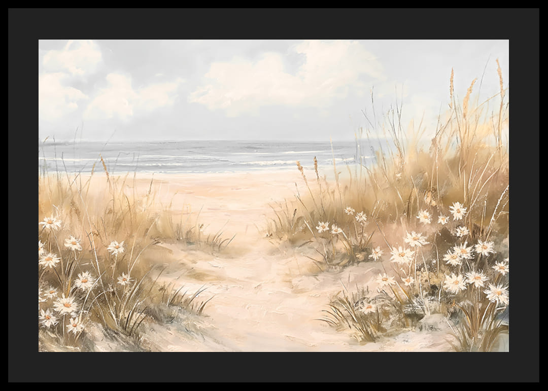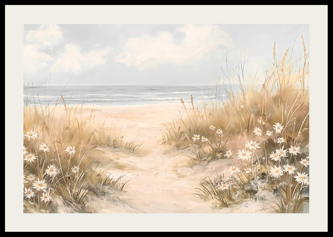 Ļaujiet šim nomierinošajam plakātam aizvest jūs uz mierīgu vietu, kur cauri kāpām uz atklāto jūru vijas maigs ceļš. Šūpojošas zāles un ziedošu pludmales ziedu ieskauts attēls rada miera, brīvības un vasaras klātbūtnes sajūtu.