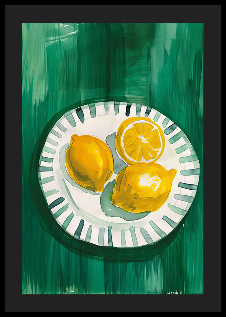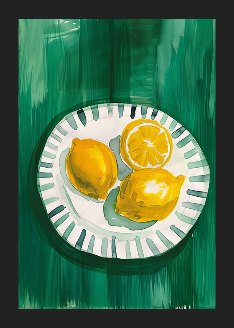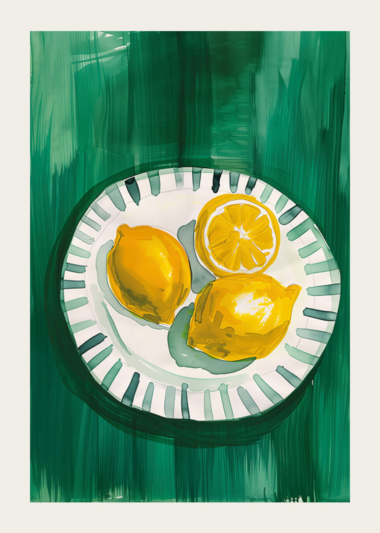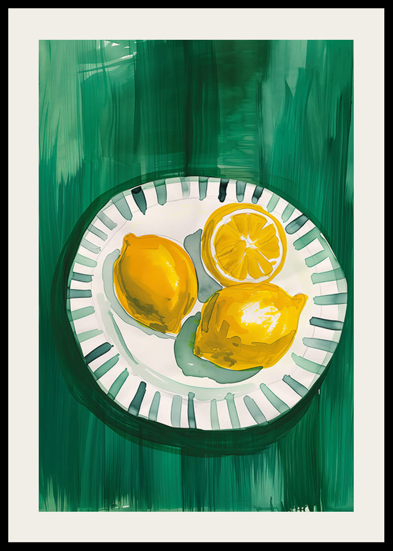 Šajā svaigajā plakātā redzami trīs saulaini dzelteni citroni, no kuriem viens ir pārgriezts uz pusēm un ir izkārtoti uz baltas šķīvja ar zaļām detaļām uz tumši zaļa fona. Spilgtās krāsas un akvareļu stils rada dzīvīgu, vasarīgu sajūtu, kas atgādina Vidusjūras svaigās smaržas.