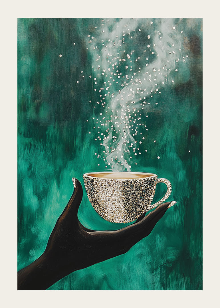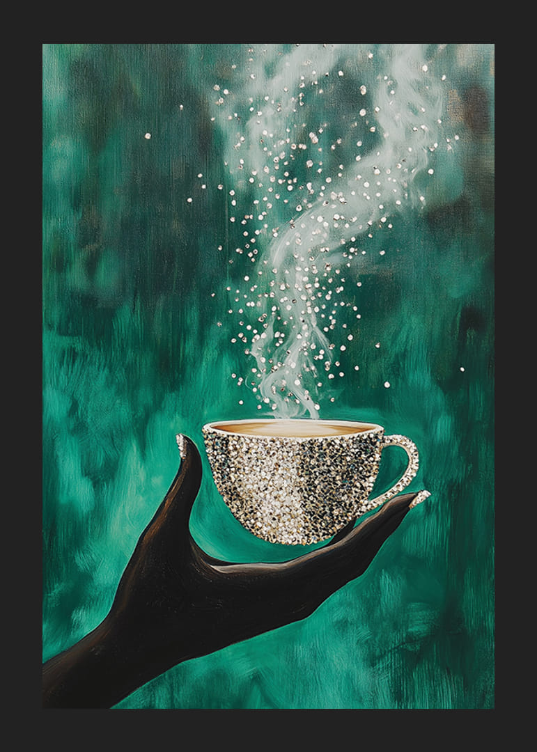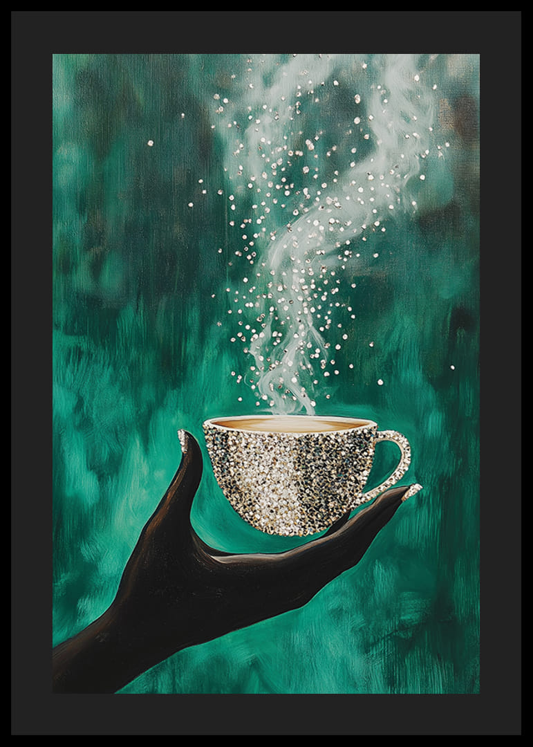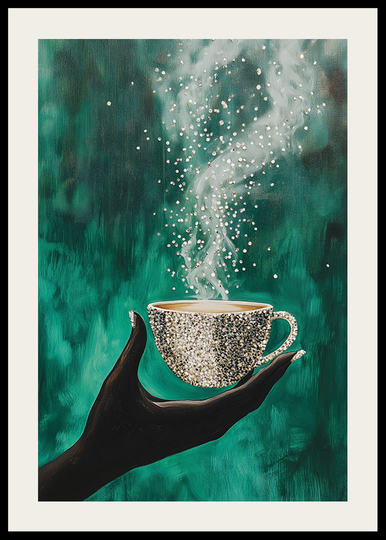 Atklājiet šī brīža burvību ar šo valdzinošo plakātu. Eleganta roka tur dzirkstošu krūzi, kas piepildīta ar kūpošu, dzīvinošu enerģiju. Uz dziļā smaragdzaļā fona dejas gaisma un kustības, radot noslēpumainības un miera sajūtu.